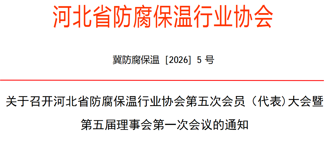 根据《社会团体登记管理条例》《河北省防腐保温行业协会章程》的相关规定,河北省防腐保温行业协会第四届理事会任期届满,经研究,决定于2026 年 4 月 24 日在河北野生原酒店召开 “河北省防腐保温行业协会第五次会员(代表)大会暨第五届理事会第一次会议”现将会议各项安排通知如下: