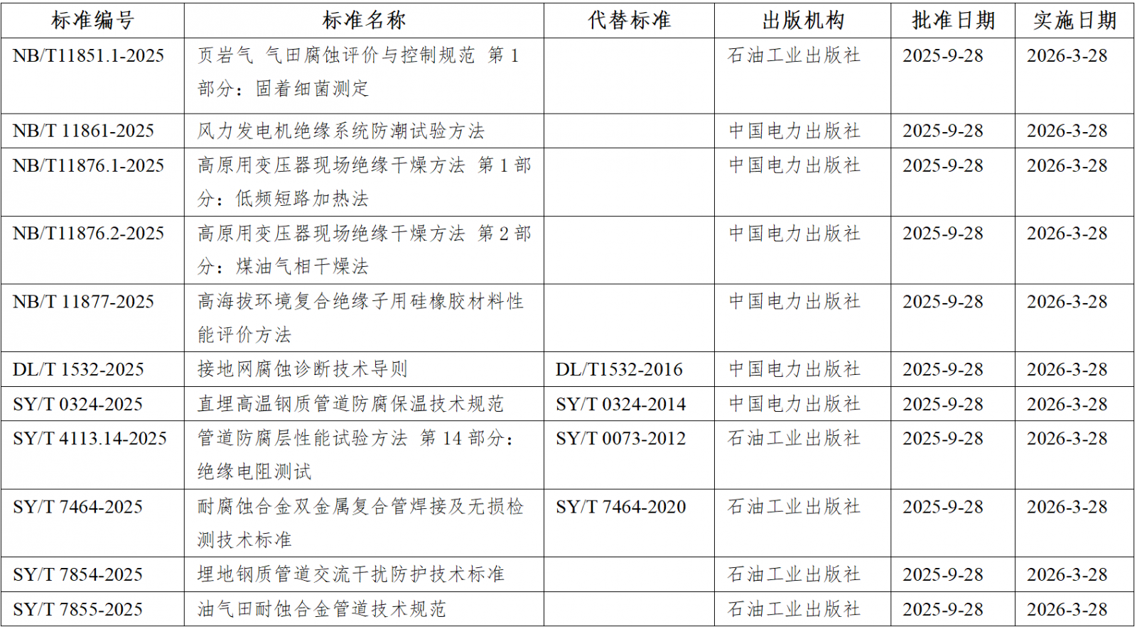 (本网讯)国家能源局近日发布2025年第5号公告,根据《中华人民共和国标准化法》《能源标准化管理办法》,国家能源局批准《注蒸汽用高温起泡剂评价方法》等307项能源行业标准、《Standard for quality of biomethane》等35项能源行业标准外文版、《水电工程覆盖层钻探技术规程》等3项能源行业标准修改通知单,现予以发布。协会秘书处将涉及防腐保温相关标准整理成下表,以供会员单位参考: